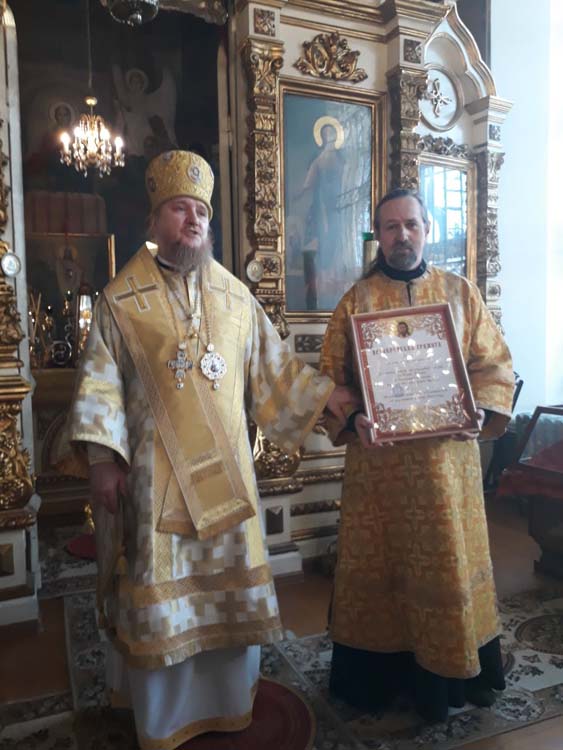 По окончании Божественной Литургии Владыка Каллистрат вручил архиерейскую грамоту алтарнику Спасского кафедрального собора Юрию Алексеевичу Русину.